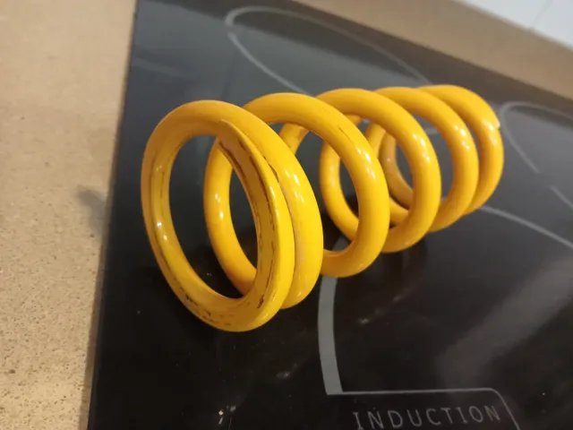 Muelle de suspensión de color amarillo. - Marca Ohlins. - Diseño en espiral. -Dureza 380 - Para recorrido 154