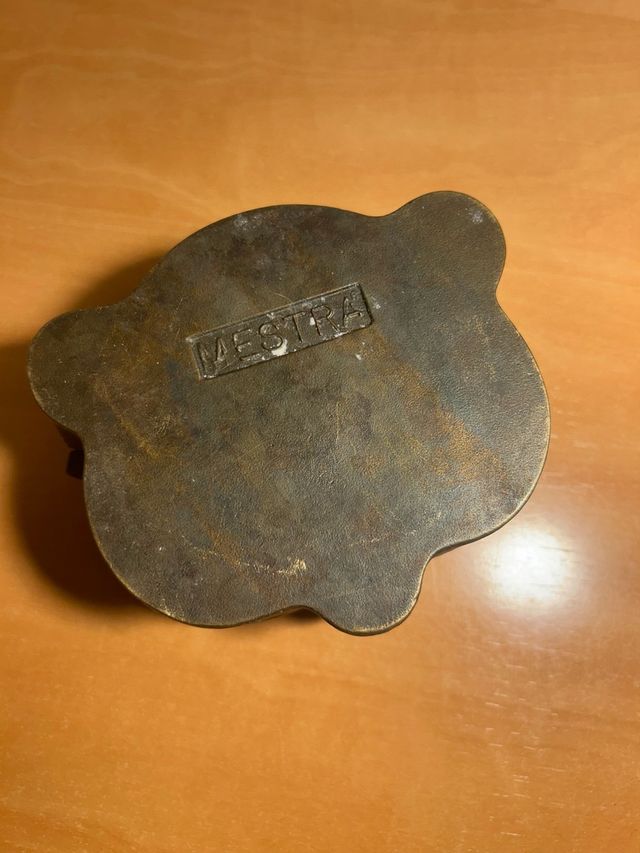 Mufla de metal para uso en prótesis dentales. El nombre de la marca 'MESTRA' está grabado en la parte superior. - Material metálico. - Grabado de marca visible.