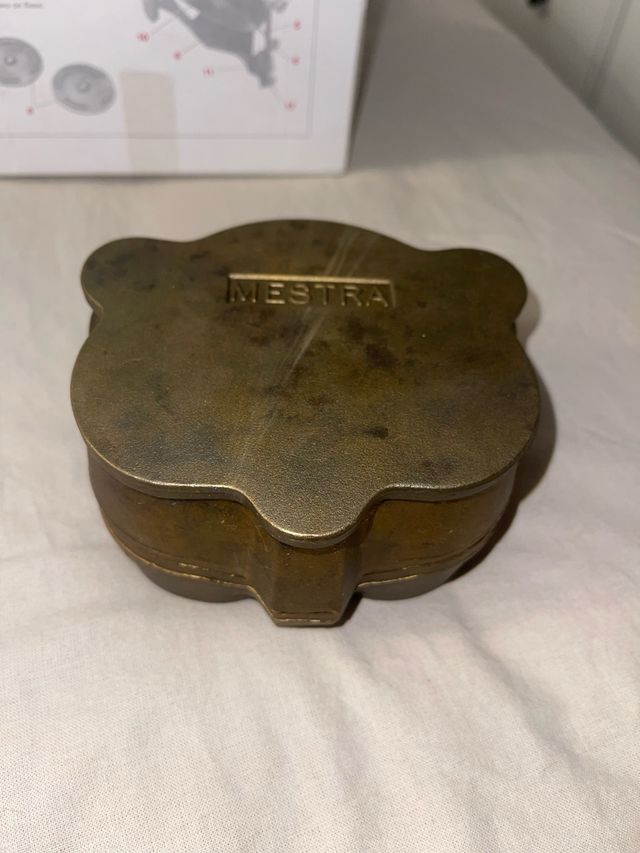 Mufla de latón para prótesis dentales, con el nombre de la marca MESTRA grabado. - Material: Latón. - Diseño con forma. - Grabado de marca. - Una solo uso