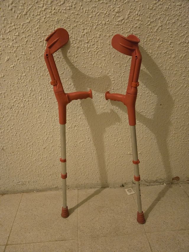 Detalles del productoPar de muletas para niños, en color marrón rojizo. Son de aluminio y tienen empuñaduras de plástico. Ideales para la recuperación de lesiones menores.