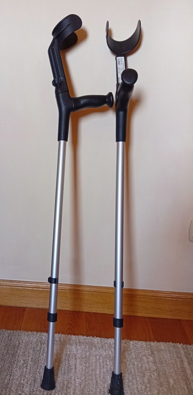 Par de muletas de ortopedia de excelente calidad, en perfecto estado. - Material: Aluminio. - Empuñaduras ergonómicas de goma. - Altura ajustable.