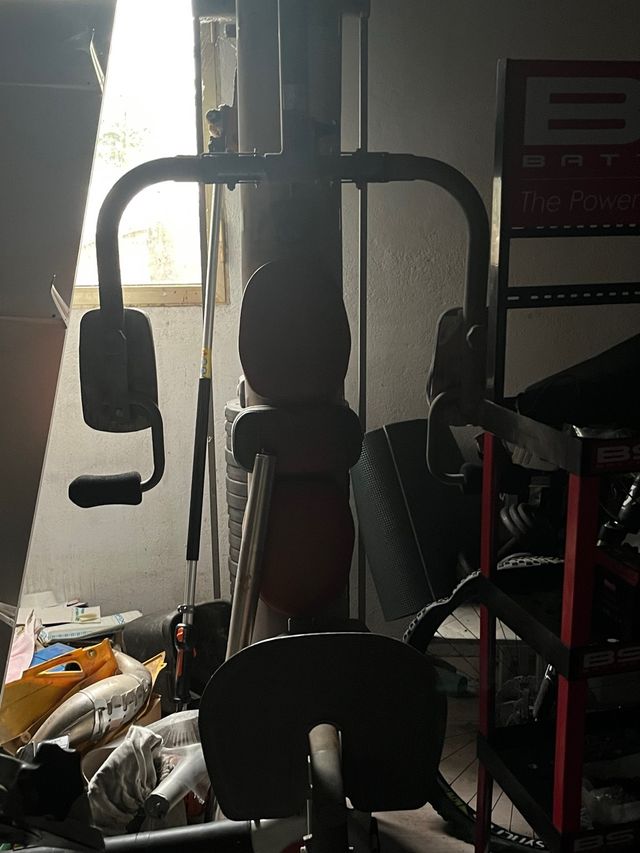 Equipo de gimnasio multiestación para entrenar en casa. - Estructura robusta. - Asiento acolchado. - Barras de pesas incluidas.
