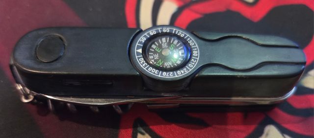 Detalles del productoPreciosa multiherramienta con brújula integrada. Es compacta y de color negro.