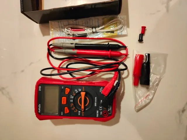 Detalles del productoMultímetro digital AoKoZo modelo 21D en color rojo. Incluye cables de prueba y accesorios.