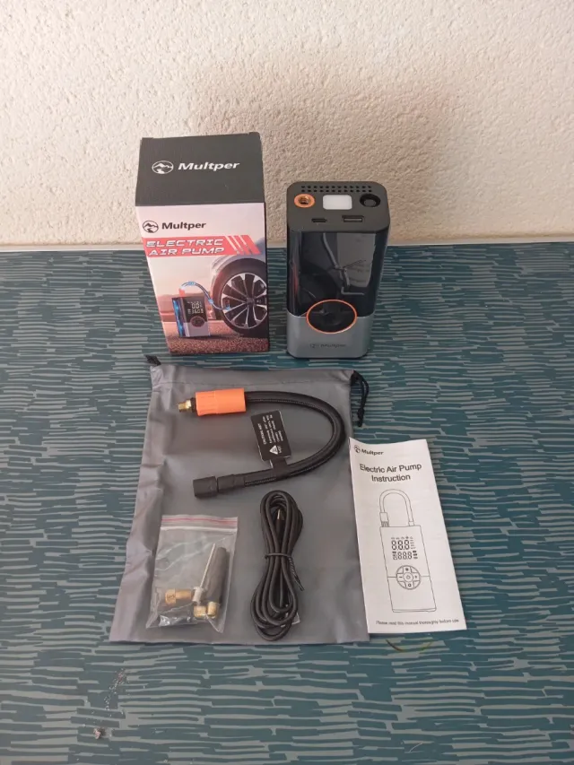 Detalles del productoCompresor eléctrico portátil de la marca Multiper. Incluye todos los accesorios para su uso.