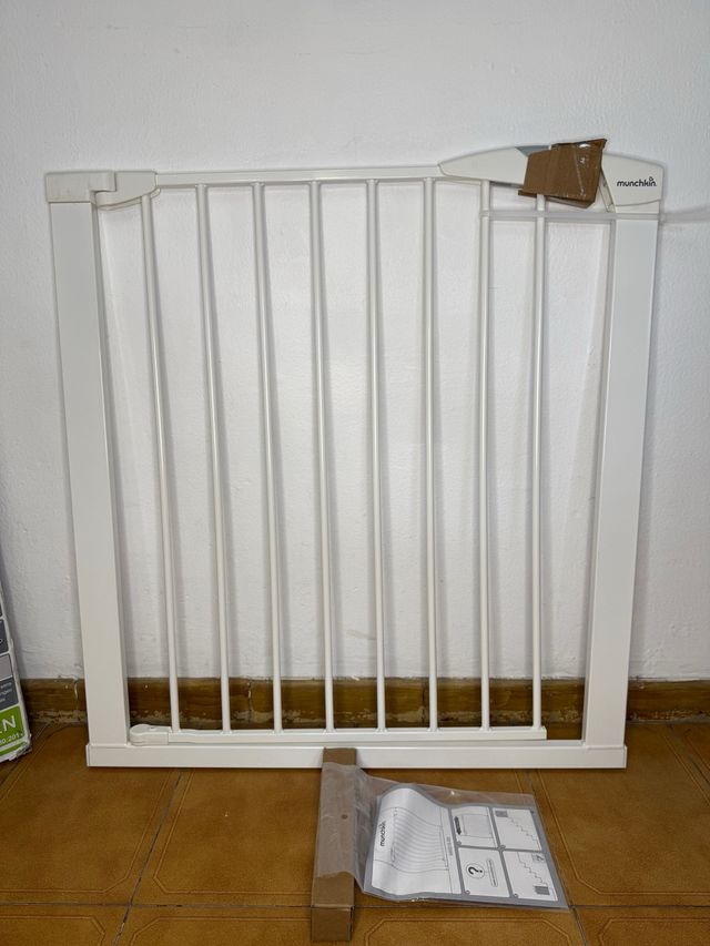 Munchkin Valla de Seguridad Infantil, Barrera de Escalera para Bebés y Niños Pequeños, Valla de Montaje Fácil sin Tornillos, Puerta de Seguridad para Bebé, Valla Metálica, 76-82 cm, Blanco