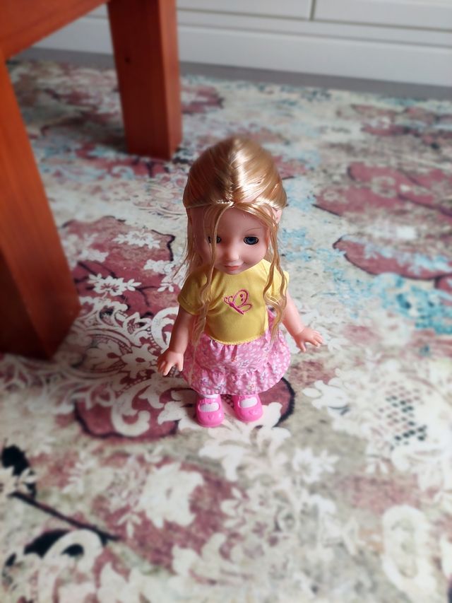 Detalles del productoMuñeca rubia de unos 30-35 cm de altura. Con vestido y zapatos tal y como se muestra en la foto.