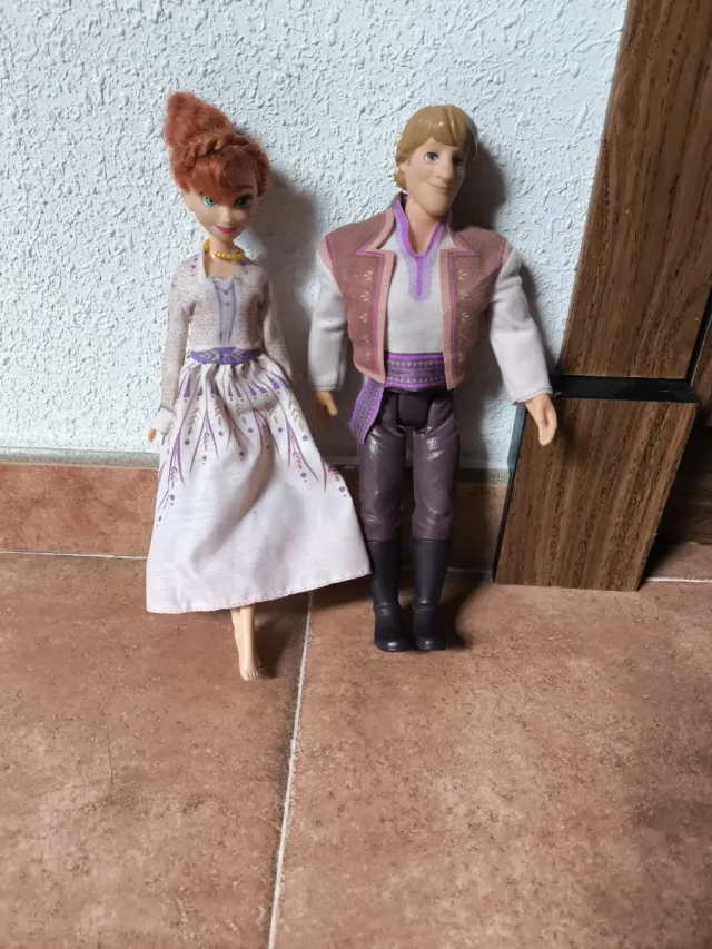 Set de muñecos de los personajes de Frozen, Ana y Kristoff. - Muñeca Ana con vestido morado y blanco. - Muñeco Kristoff con chaleco y pantalones morados.