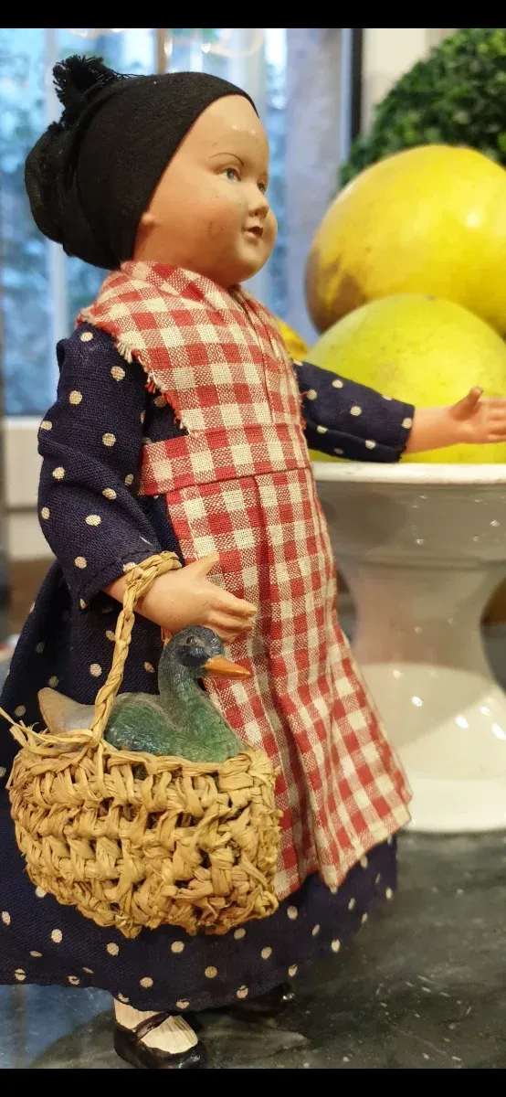 Detalles del productoMuñeca antigua de celuloide con traje tradicional de casera vasca. Incluye una cesta de mimbre con un pato.