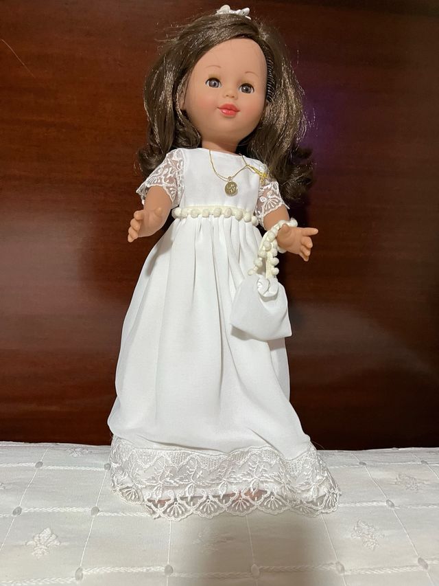 Detalles del productoMuñeca de comunión de la marca Arias. Viste un elegante traje blanco. No lleva zapatos