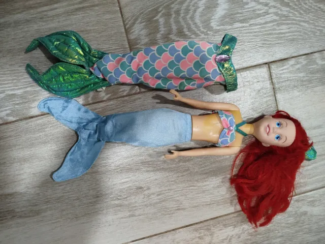 Muñeca de Ariel, la Sirenita, con su característica cola de sirena. - Cola de sirena azul. - Cola de sirena verde brillante. - Bikini a juego con la cola.