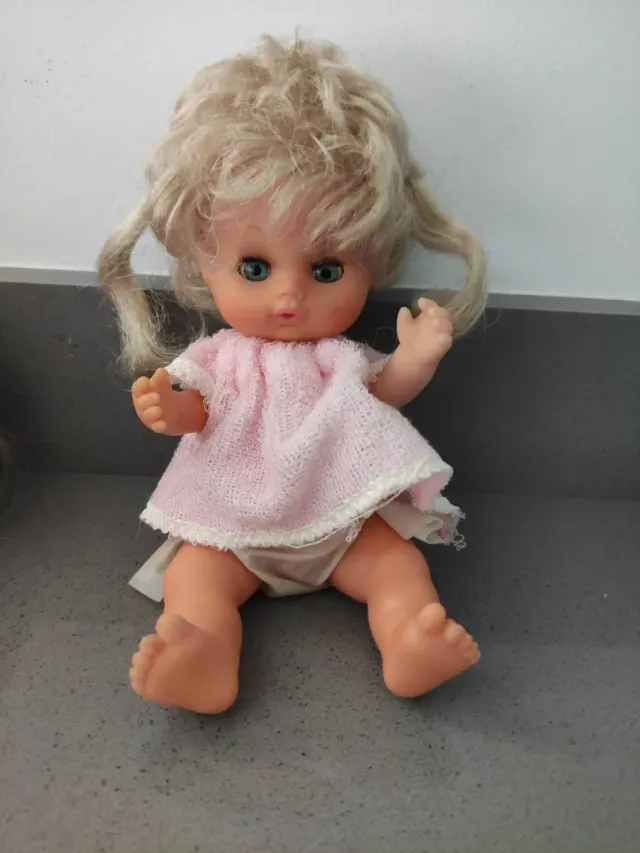 Detalles del productoMuñeca Baby Mocosin con vestido rosa.