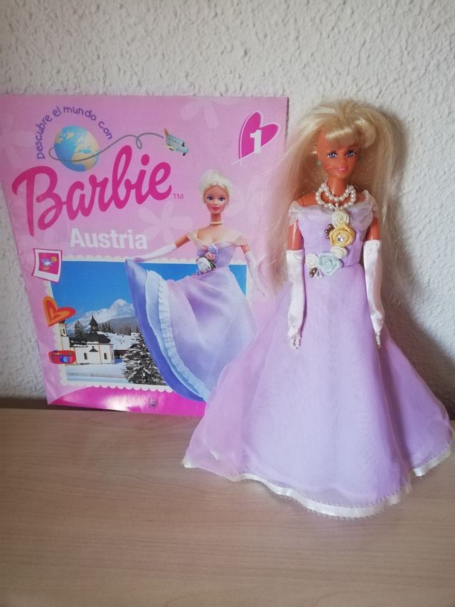 Detalles del productoMuñeca Barbie Austria. Vestido de gasa color lila y ribete marfil en el bajo,con forro. Tiene collar, pulseras, pendientes y guantes. Se acompaña de cuaderno con información sobre Austria. Está en muy buen estado.