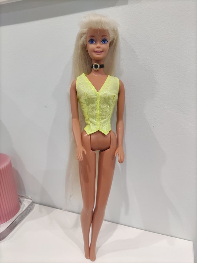 Detalles del productoPreciosa muñeca Barbie de los años 90, en buen estado. Tiene el pelo largo y rubio, y viste un chaleco amarillo. Incluye un collar. Es una pieza ideal para coleccionistas o amantes de las muñecas Barbie clásicas. - Muñeca Barbie vintage. - Pelo largo y rubio. - Viste un chaleco amarillo. - Incluye un collar.