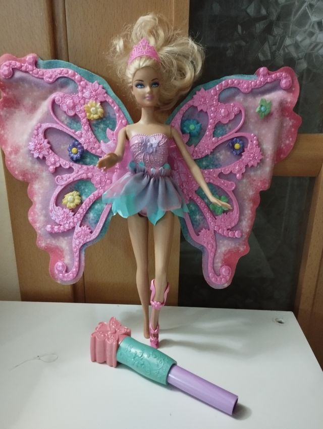 Detalles del productoPreciosa muñeca Barbie hada con alas de mariposa. Incluye una varita mágica. La muñeca está en buen estado, aunque puede tener algunas señales de uso.