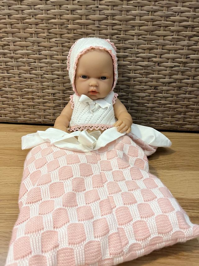 Detalles del productoMuñeca bebé de la marca Arias, con un bonito conjunto de ropa y manta arrullo. color blanco y rosita maquillaje.