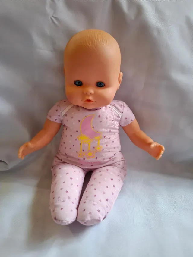 Muñeca bebé con un adorable pijama. - Pijama rosa con estampado de estrellas y luna. - Ojos azules. - Pelo rubio.