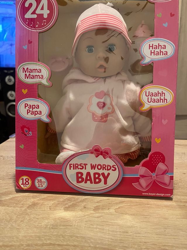 Detalles del productoMuñeca bebé First Words de Bayer, ideal para los más pequeños. Incluye accesorios.