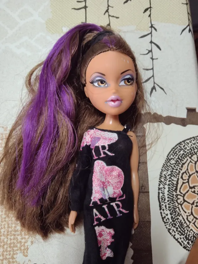 Muñeca Bratz con un estilo único. - Pelo largo castaño con mechones morados. - Vestido negro con estampado floral y texto.