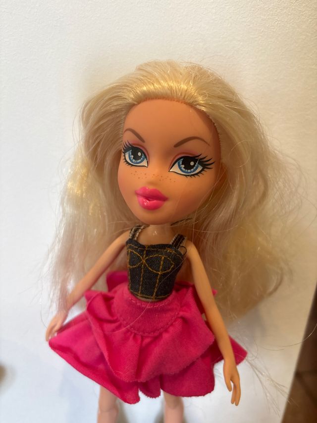 Muñeca Bratz con cabello rubio y un conjunto de dos piezas. - Corsé negro con detalles. - Falda rosa con volantes.