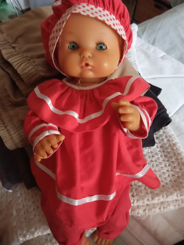 Detalles del productoMuñeca de bebé con un bonito traje rojo y gorrito a juego.