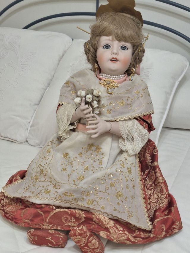 Detalles del productoPreciosa muñeca de porcelana articulada,con pelo natural,joyas,ropa bordada es bastante antigua ,mide más de 80 cm sentada supera los 50 cm pesa aproximadamente unos tres/cuatro kilos,fíjate en su cara es de una belleza singular.NO MOLESTAR SI NO TE INTERESA PORFAVOR.EL PRECIO E algo NEGOCIADLE Medidas del producto