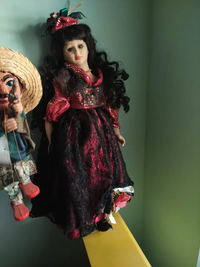 Preciosa muñeca de porcelana con un vestido elegante. Tamaño grande unos 50cm - Detalle de encaje negro y rojo. - Adorno en el cabello. - Base de soporte incluida.