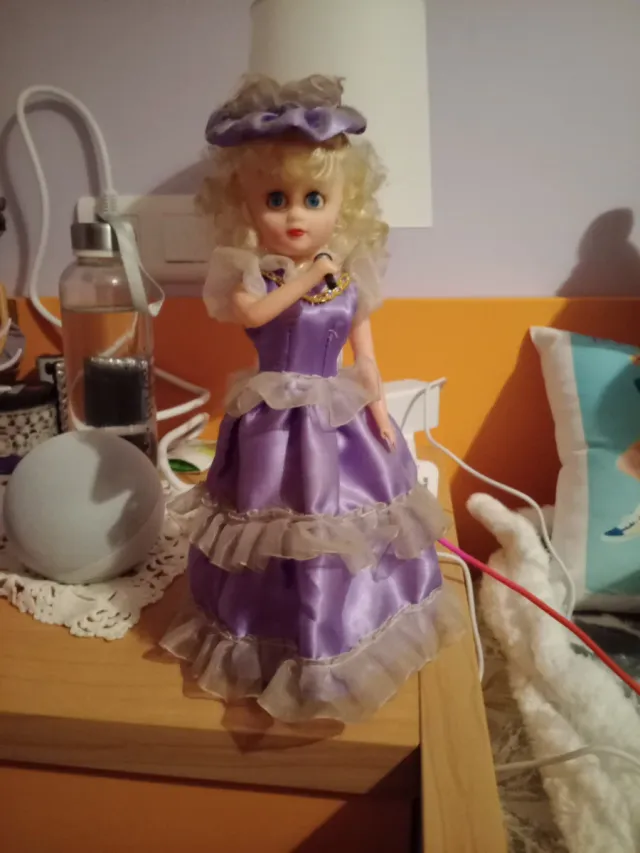 Preciosa muñeca con un vestido morado de volantes. - Vestido de satén morado con detalles de tul. - Adorno dorado en el cuello. - Pequeño sombrero a juego.