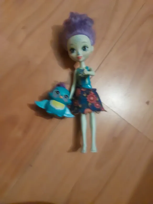 Muñeca Enchantimals con su compañero pájaro. - Muñeca con pelo morado. - Vestido estampado floral. - Figura de pájaro azul.