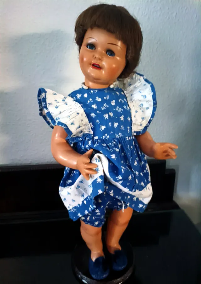 Detalles del productoPreciosa muñeca Gisela, marcada. Viste un bonito vestido azul con estampado floral blanco y azul lo.mas destacado es la braguita a juegos posiblemente original lo llevaba la muñeca aunque no está marcado.