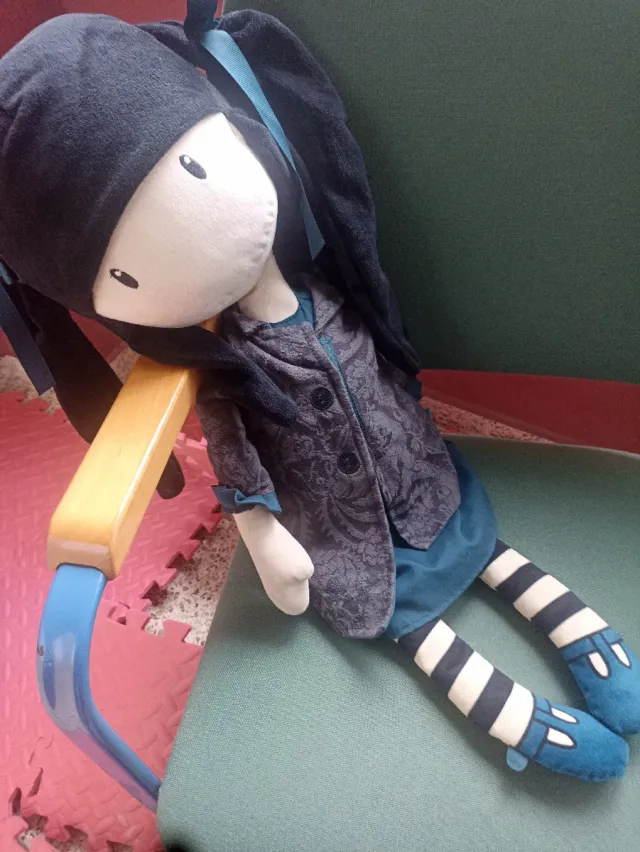 Detalles del productoMuñeca grande de la marca Gorjuss. Tiene el pelo largo y oscuro recogido en dos coletas con lazos azules. Viste un vestido azul oscuro, una chaqueta gris con un estampado floral y calcetines de rayas blancas y negras.