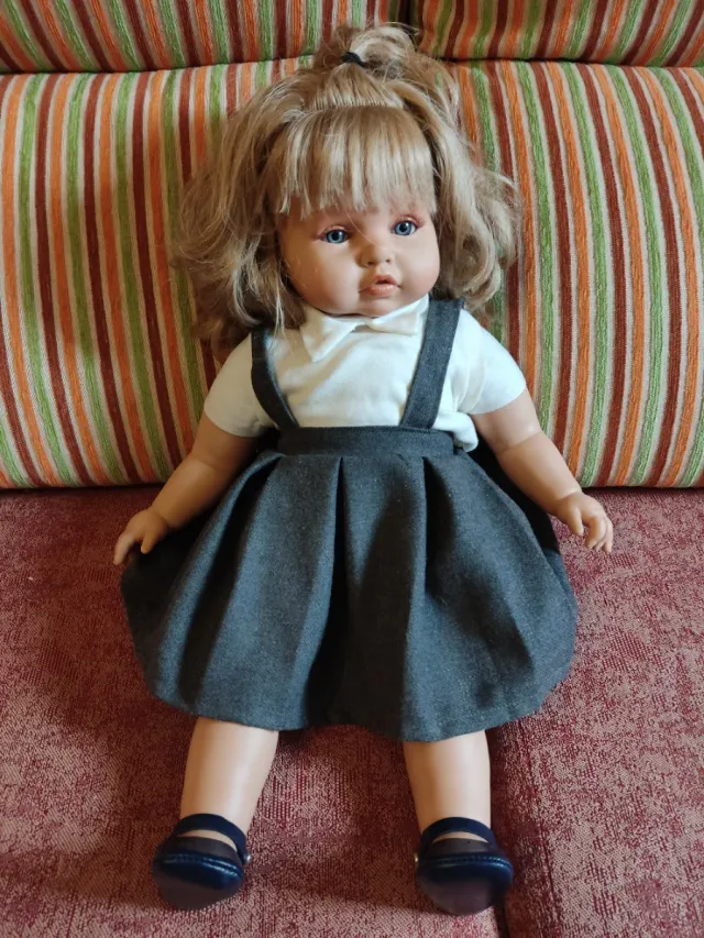 Muñeca de estilo clásico, inspirada en la Infanta Leonor. - Vestido gris con tirantes. - Blusa blanca. - Zapatos marrones.