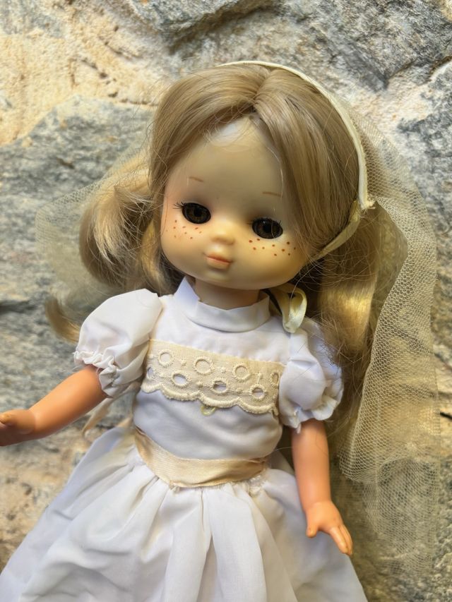 Muñeca Lesly de Famosa, con un bonito vestido blanco. - Vestido blanco con detalles de encaje. - Incluye velo y cinta en la cintura.
