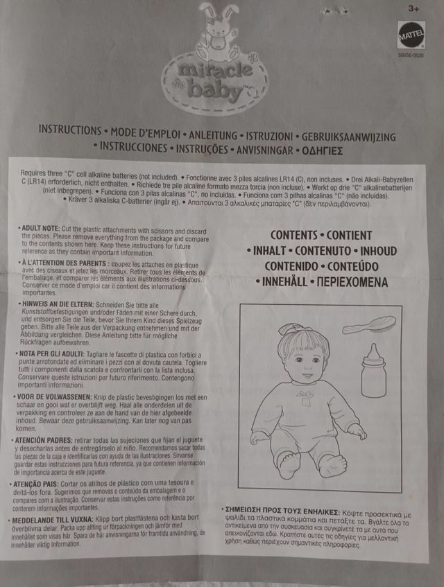 Muñeca de la marca Miracle Baby. - Requiere 3 pilas alcalinas tipo C (no incluidas). - Contiene instrucciones importantes para su uso y conservación.