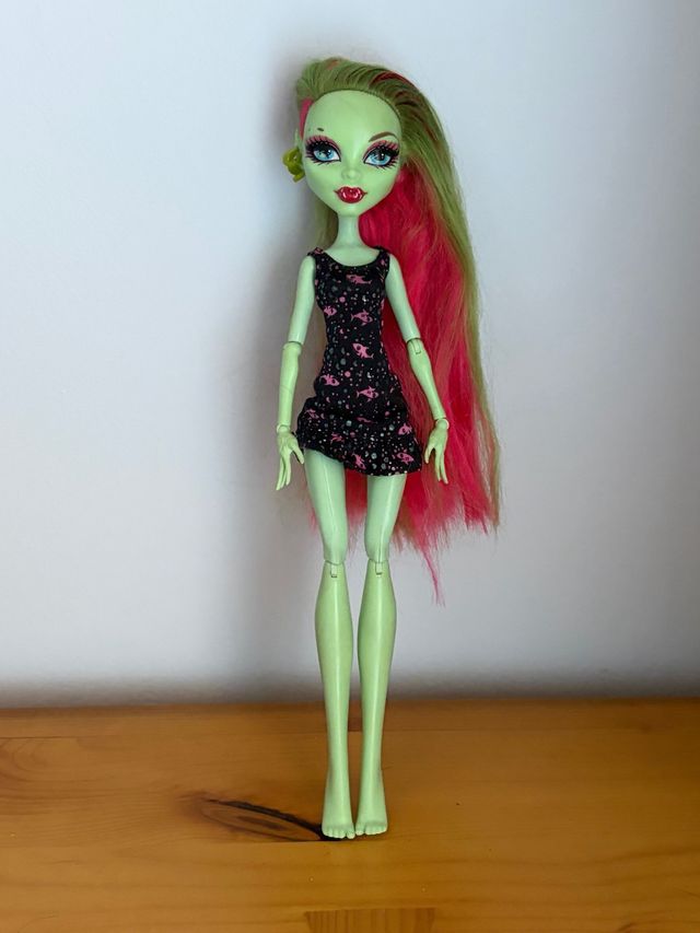 - Piel de color verde claro. - Cabello largo con mechones rosas. - Vestido negro con estampado de peces rosas.