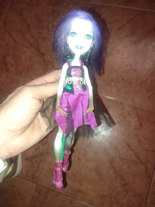 Muñeca de la marca Monster High con pelo morado y vestido rosa y negro. - Vestido con detalles plateados y cinturón. - Botas rosas. - Falda de tul negra.