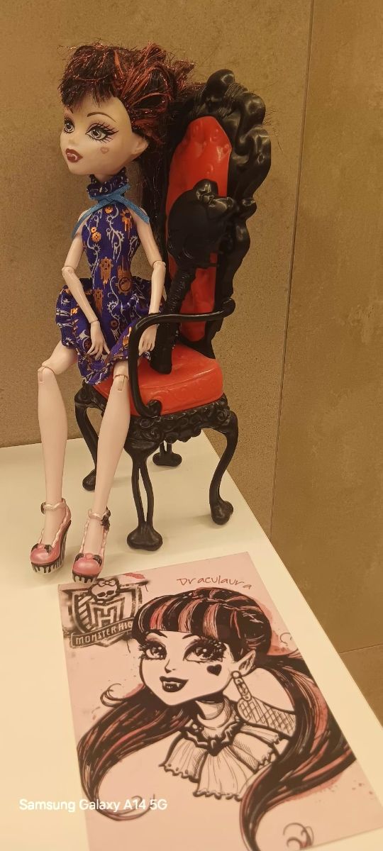 Detalles del productoMuñeca Monster High, personaje Draculaura, sentada en su silla.