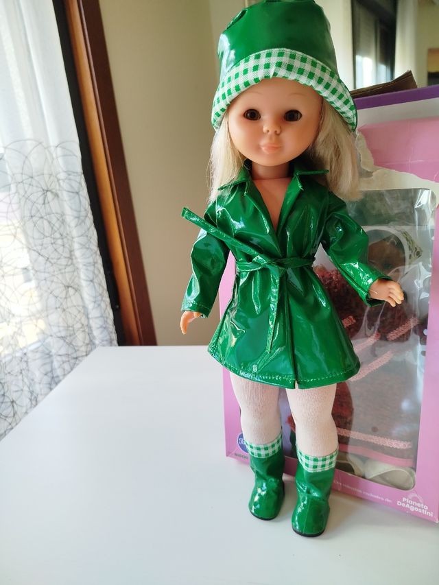 Detalles del productoMuñeca Nanci con un conjunto de impermeable verde brillante. Articulada.