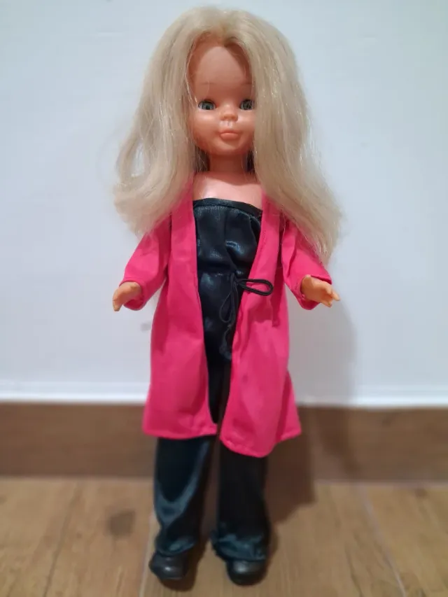 Detalles del productoMuñeca Nancy articulada con pelo rubio y ojos azules. Viste un conjunto de mono negro satinado y chaqueta larga rosa. En perfecto estado.
