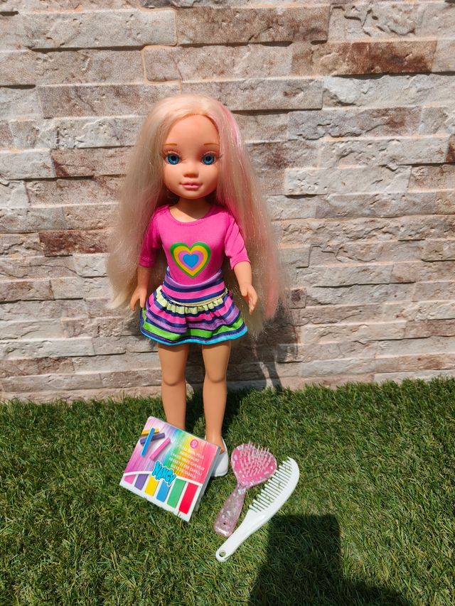 Detalles del productoPreciosa muñeca Nancy con el pelo parcialmente teñido de rosa. Incluye dos peines y una caja de tizas para el pelo, nuevas sin usar. La muñeca está en buen estado.