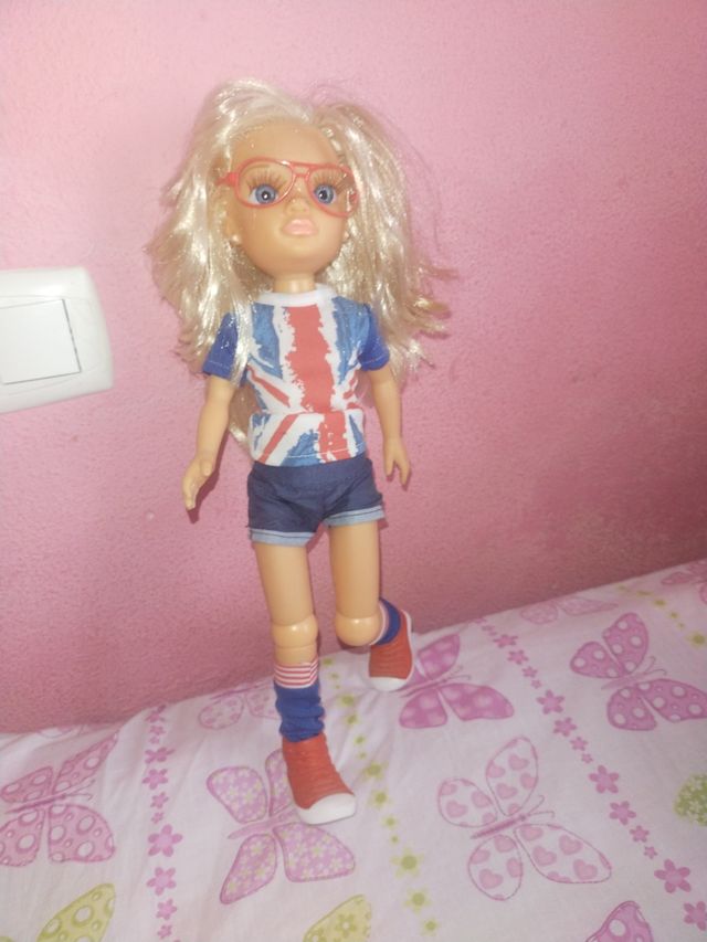 Detalles del productoPreciosa muñeca Nancy con gafas, camiseta con estampado de bandera británica y conjunto deportivo. Es una muñeca muy estilosa y está en buen estado.