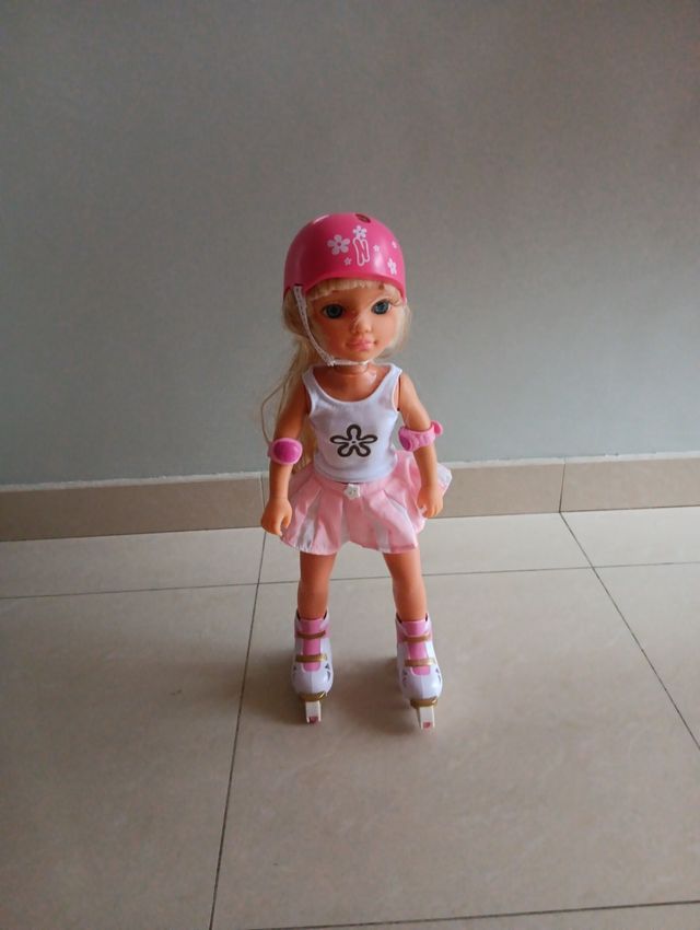 Muñeca Nancy vestida de patinadora, lista para la acción. - Incluye casco rosa. - Protecciones para codos y rodillas. - Patines blancos con detalles rosas.
