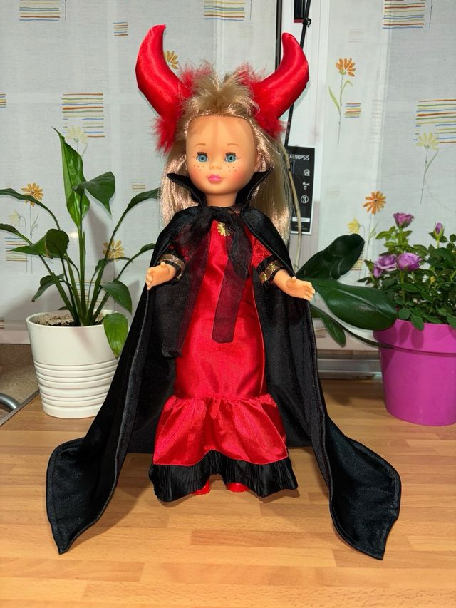 Detalles del productoPreciosa muñeca Nancy reedición en perfecto estado vestida de Diablesa. Es una preciosidad de ojos azules, pecas y melena rubia con corte de pelo ochentero. Lleva un bonito vestido rojo con capa negra a juego y unos graciosos cuernecitos. Posibilidad de comprar el traje por separado. Envío aparte.
