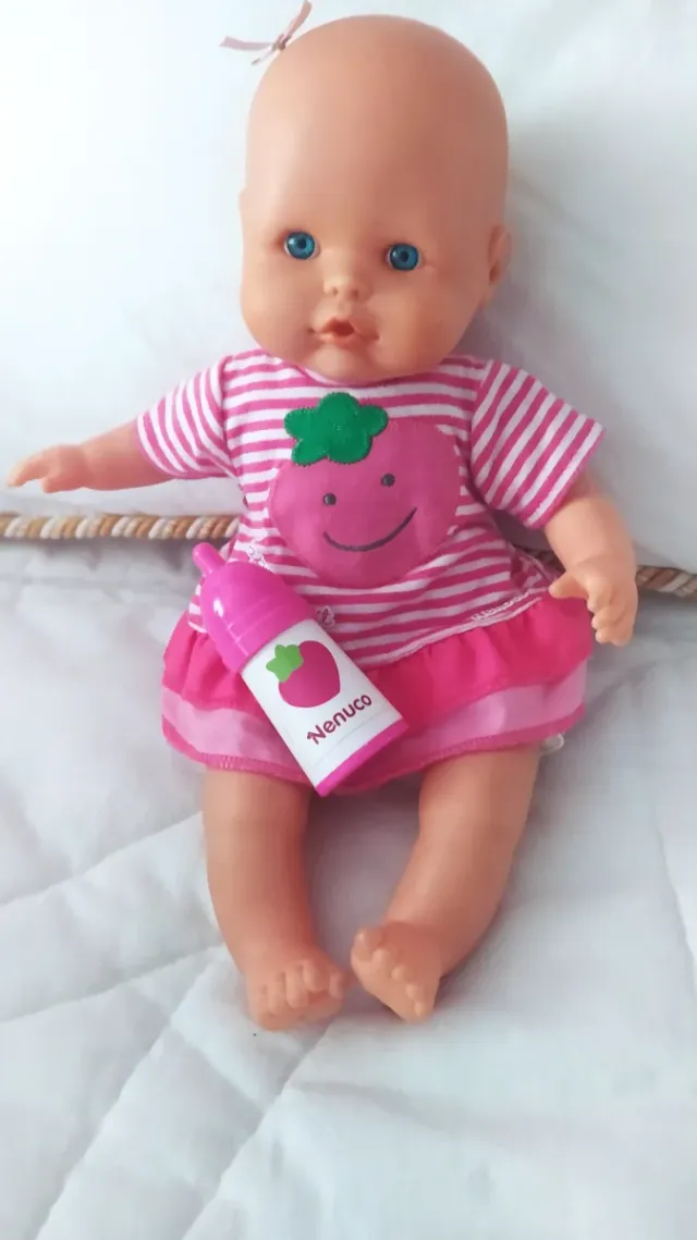 Muñeca Nenuco con su biberón. - Vestido a rayas rosas y blancas con estampado de fresa. - Incluye biberón rosa con estampado de fresa y el logo de Nenuco. Muy nuevo.