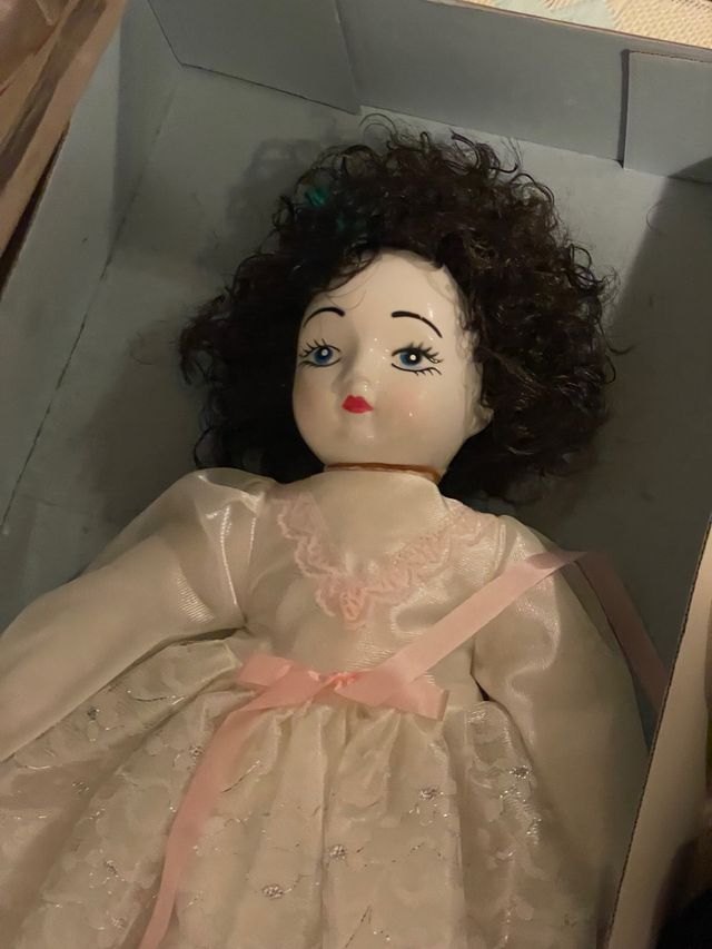 Detalles del productoPreciosa muñeca de porcelana con un elegante vestido blanco y detalles en rosa.