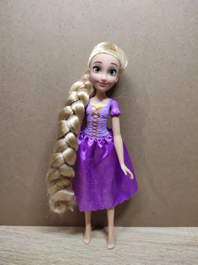 Muñeca de Rapunzel, personaje de Disney, con su icónico vestido morado. - Vestido morado brillante. - Cabello largo rubio trenzado. - Brazos y piernas articulados.