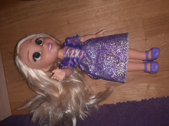 Muñeca de Rapunzel con su característico vestido. - Vestido morado brillante. - Zapatos morados. - Pelo largo rubio.