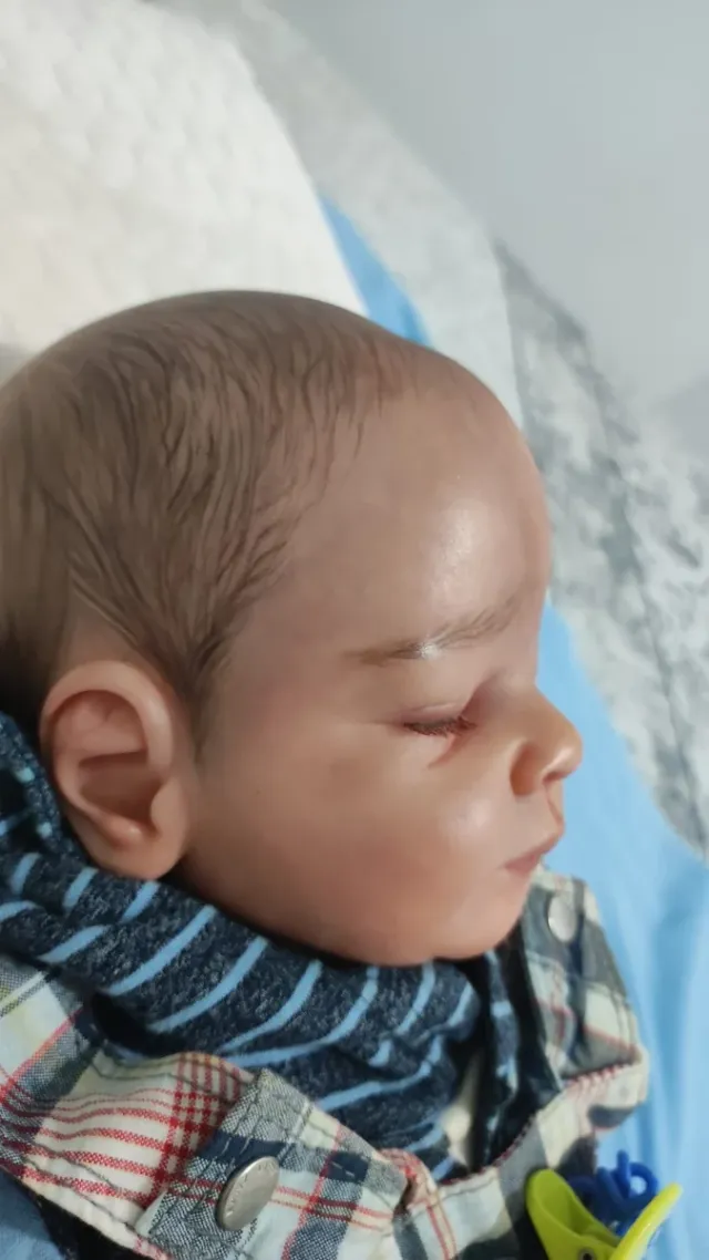 Muñeca reborn de alta calidad, con detalles realistas. - Pelo injertado. - Ojos de cristal. - Cuerpo de tela y extremidades de vinilo.