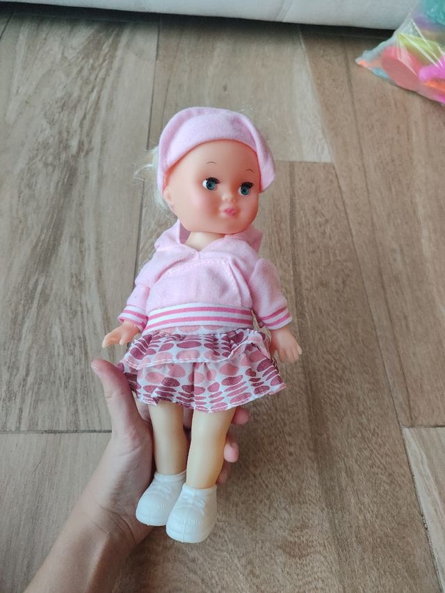 Muñeca de plástico con ropa. - Vestido rosa con estampado. - Sudadera con capucha. - Gorro a juego.