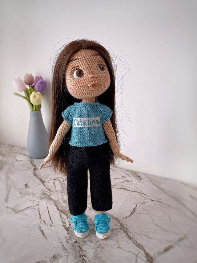 Detalles del productoEsta encantadora muñeca tejida a mano mide 35 cm de altura, siendo el regalo perfecto y único para cualquier ocasión. Con un tiempo de confección de 15-20 días, cada muñeca es cuidadosamente elaborada con detalles minuciosos. Su cabello largo, ojos expresivos y ropa personalizada, como su camiseta con nombre, la hacen verdaderamente especial. Confeccionada con materiales de alta calidad y diseñada con un estilo moderno, esta muñeca no solo es un juguete, sino también una pieza de colección o un adorno encantador para cualquier habitación.